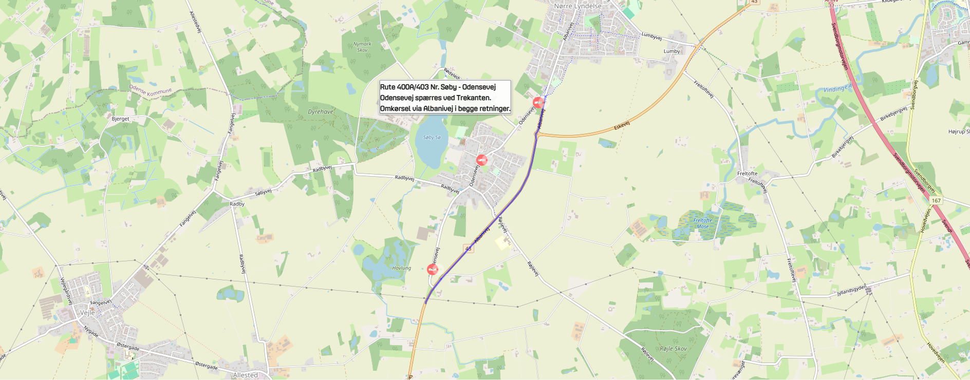 Odensevej spærres ved Trekanten fra mandag d. 16. februar til og med fredag d. 27. februar 2026. Omkørsel via Albanivej i begge retninger. Der opstilles midlertidige stoppesteder på Albanivej ved Røjlevej.